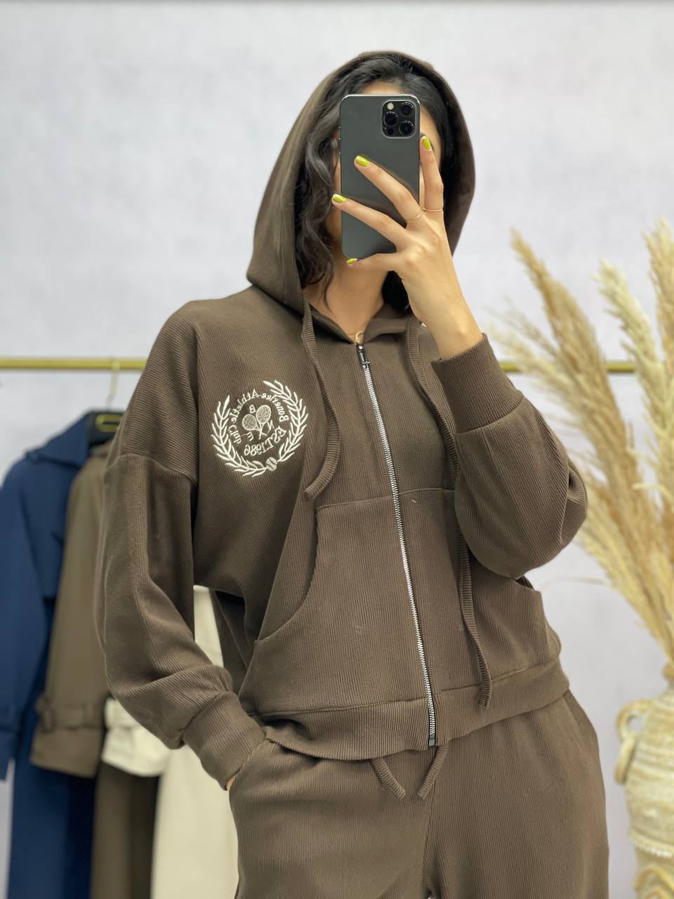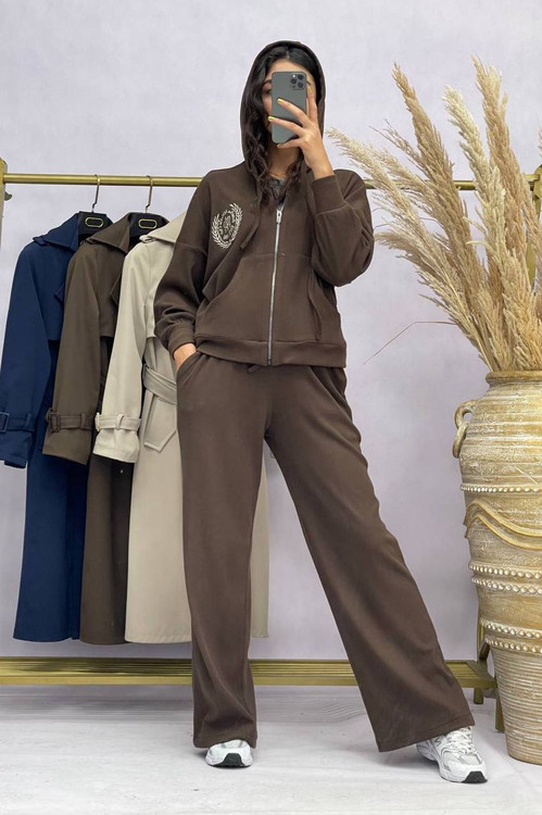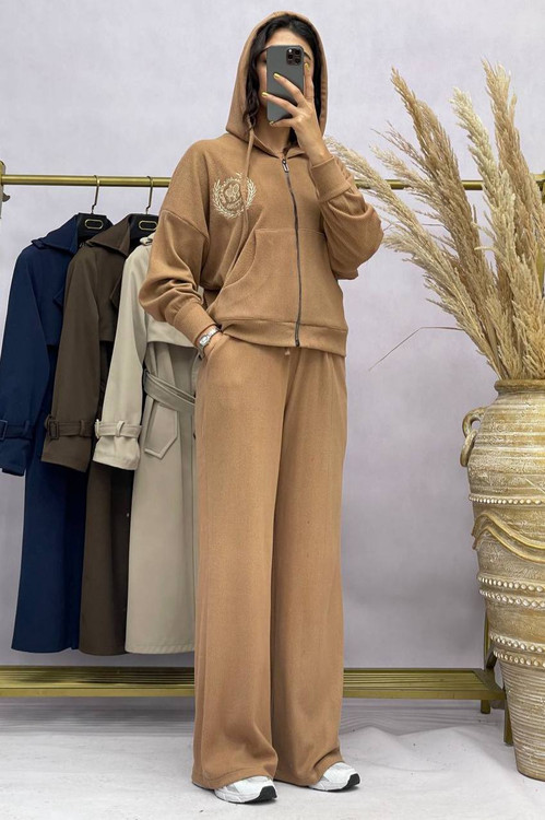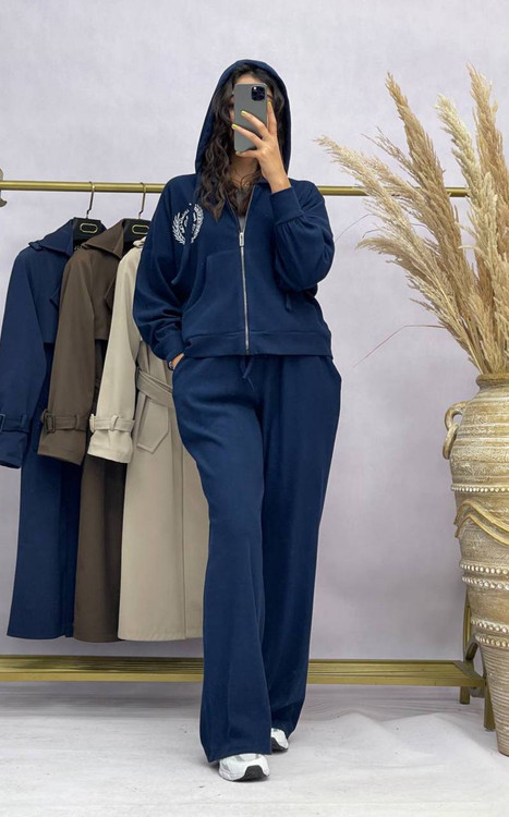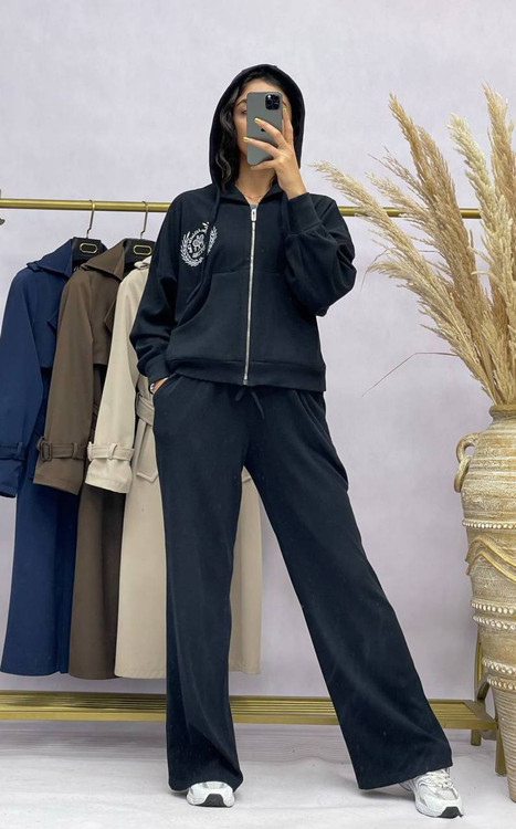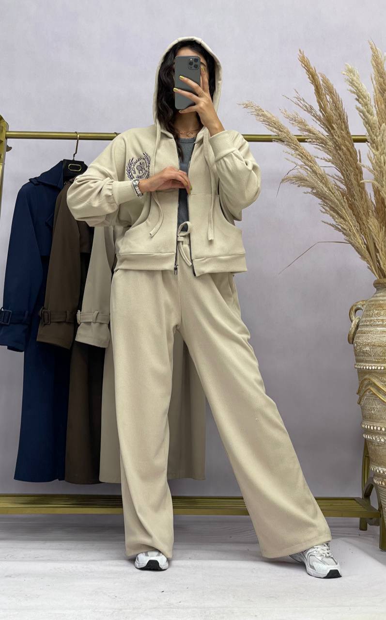ست سوییشرت کلاهدار و شلوار زنانه به صورت فری سایز( ۳۶ تا ۴۶) با جنس بازل با گلدوزی خاص مناسب استفاده روزمره و پیاده روی و ورزش میباشد